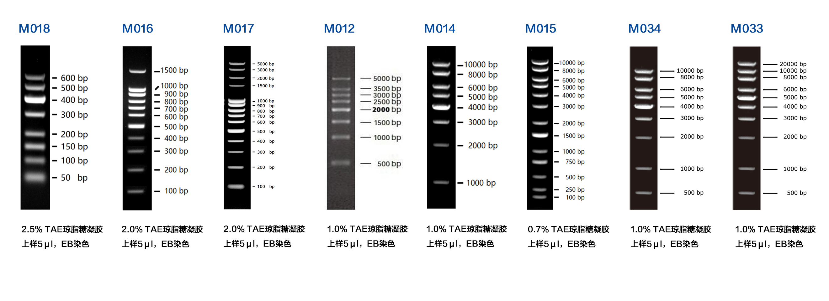 本產(chǎn)品為預(yù)混有 1x 上樣緩沖液的即用型 DNA 分子量標(biāo)準(zhǔn),由 8 條線狀雙鏈 DNA 條帶組成,適用于對 1000-10000 bp 的雙鏈 DNA 分子大小的估算和粗略定量。本產(chǎn)品的 8 條帶分別為 1000、2000、3000、4000、5000、6000、8000 和 10000 bp。其中 4000 bp 條帶濃度最大,為 20 ng/µl,其余條帶濃度約為 10 ng/µl。
