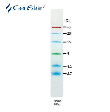 本產(chǎn)品包含了 2.7-40 kDa 的 6 種高度純化并預(yù)染的重組蛋白質(zhì)。6 種條帶分別為:2.7、4.2、8、15、25、40 kDa。其中 8 kDa 條帶為綠色預(yù)染條帶,40 kDa 條帶為橙紅色預(yù)染條帶,方便判斷各個條帶準(zhǔn)確位置。