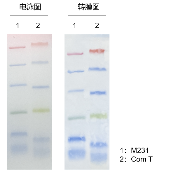 分別使用GenStar #M230 和 Com T進行電泳,Tricine 膠濃度18%,上樣量5 μl、電壓150 V,電泳100 min,電泳結(jié)束后進行轉(zhuǎn)膜實驗,轉(zhuǎn)膜電壓200 V、時間60 min。結(jié)果顯示,M230電泳和轉(zhuǎn)膜條帶均清晰可見,小條帶效果優(yōu)于Com T。