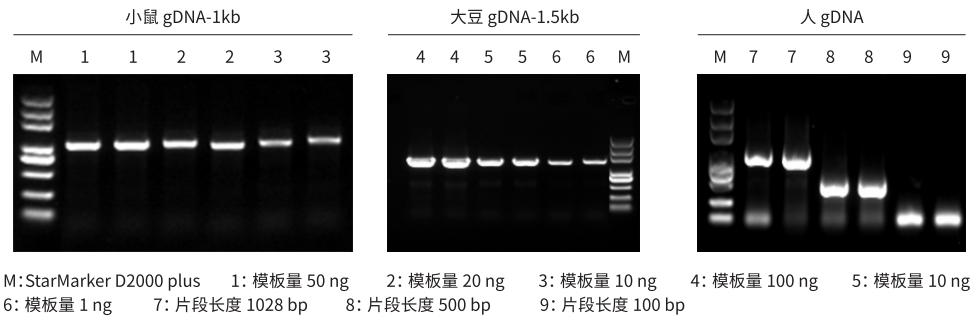 以小鼠 gDNA(50 ng、20 ng、10 ng)大豆 gDNA(100 ng、10 ng、1 ng)和人 gDNA(50 ng)為模板,使用 A008 擴(kuò)增進(jìn)行擴(kuò)增。結(jié)果顯示,A008 對動物、植物等不同來源模板擴(kuò)增性能表現(xiàn)優(yōu)異