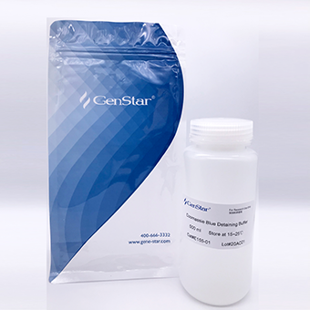 考馬斯亮藍(lán)染色脫色液(Coomassie Blue Destaining Buffer),可以搭配考馬斯亮藍(lán) G-250 染色液(GenStar#E154),用于 SDS-PAGE 或非變性 PAGE 等蛋白電泳凝膠的常規(guī)染色和脫色,或 Western 轉(zhuǎn)膜后 PAGE 膠上殘余蛋白的檢測。