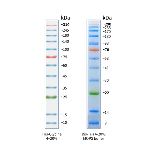本產(chǎn)品由跨度從 10-310 kDa 的 12 種高度純化預(yù)染的重組蛋白質(zhì)組成,各條帶濃度約為 0.1-0.4 mg/ml。其中 25 kDa 條帶為綠色預(yù)染條帶、75 kDa 和 310 kDa 條帶為紅色預(yù)染條帶,方便判斷各個(gè)條帶的準(zhǔn)確位置。本產(chǎn)品適合作為 SDS-PAGE 電泳時(shí),變性蛋白樣品的分子量參照,并可實(shí)時(shí)觀察蛋白樣品的電泳分離狀況,也可用于檢測 Western blot 的轉(zhuǎn)膜效率。由于共價(jià)結(jié)合的染料會(huì)影響蛋白質(zhì)分子的電泳遷移率,本產(chǎn)品僅適于粗略地估計(jì)目的蛋白樣品的分子量。