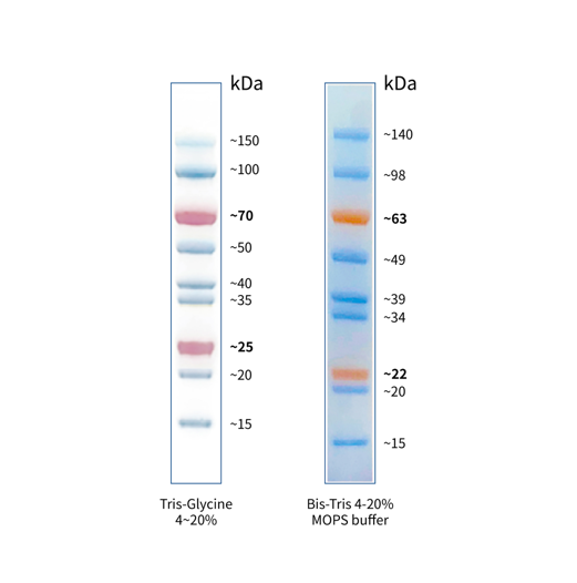 本產(chǎn)品由跨度從 15-150 kDa 的 9 種高度純化的橙色、藍色預(yù)染蛋白質(zhì)組成。其中 25 kDa 條帶和 70 kDa 條帶為橙紅色預(yù)染條帶。本產(chǎn)品適合作為 SDS-PAGE 電泳時,變性蛋白樣品的分子量參照,并可實時觀察蛋白樣品的電泳分離狀況,也可用于檢測 Western blot 的轉(zhuǎn)膜效率。由于共價結(jié)合的染料會影響蛋白質(zhì)分子的電泳遷移率,本產(chǎn)品僅適于粗略地估計目的蛋白樣品的分子量。
