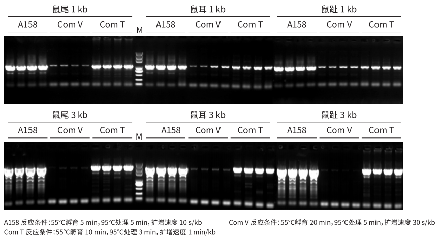 以鼠尾、鼠耳、鼠趾裂解液為模板,分別使用 A158、Com V、Com T 進行擴增。結果顯示,A158 較 Com V、Com T 裂解速度和擴增速度更快,擴增效率更高