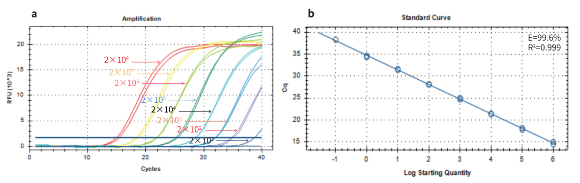 對濃度范圍為 2×101~2×108 copies/μl 的某 DNA 病毒陽性質粒,用 GenStar #A392 進行 qPCR 檢測,結果顯示,GenStar #A392 可檢測出最低 DNA 量為 20 copies/μl。