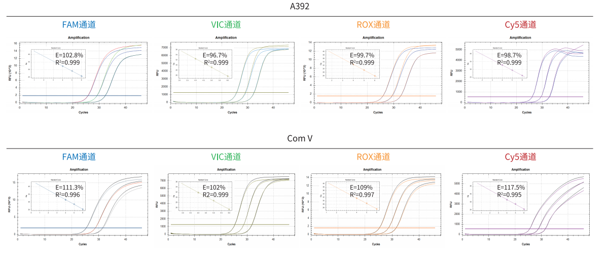 GenStar #A392 與 Com V 同時進行四重 qPCR 檢測,結果顯示,四通道檢測結果均良好,尤其 FAM、Cy5、ROX 通道擴增效率優(yōu)于 Com V。