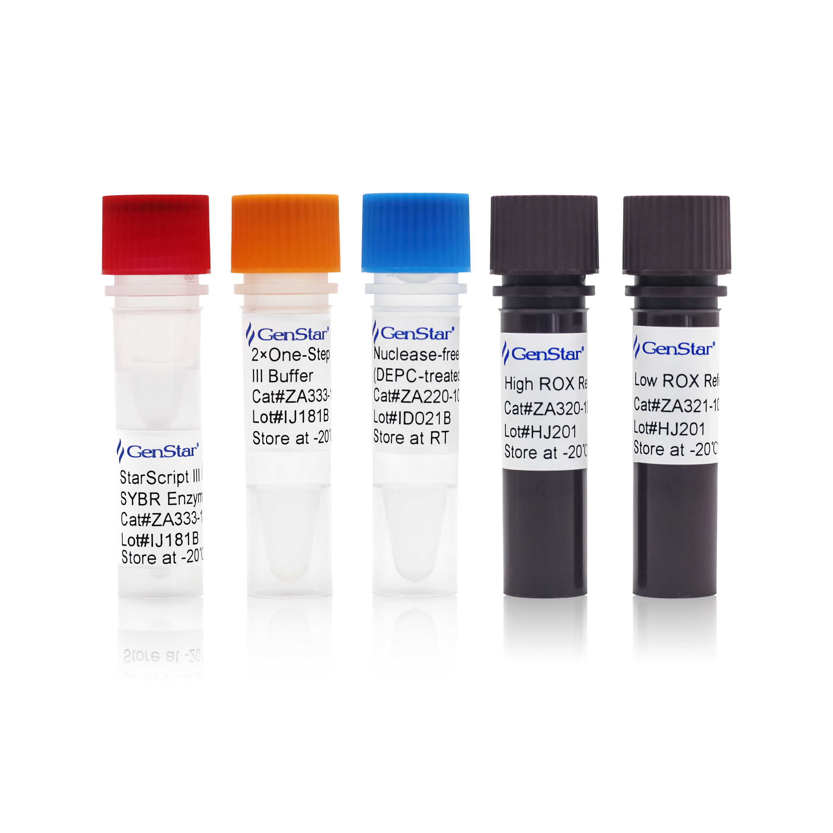 StarScript III One-Step qRT-PCR SYBR Kit 是采用 SYBR Green I 嵌合熒光法進(jìn)行一步法實時熒光定量檢測的專用試劑盒。使用本制品進(jìn)行 Real Time RT-PCR 反應(yīng)時以提取的 RNA 為模版,在同一反應(yīng)管內(nèi)連續(xù)進(jìn)行反轉(zhuǎn)錄和熒光定量檢測,操作簡單,并能有效防止污染。基于 StarScript III 反轉(zhuǎn)錄酶、抗體型 HotStart Taq DNA 聚合酶、配合優(yōu)化的 Buffer 體系,對于二級結(jié)構(gòu)復(fù)雜和 GC 含量高的 RNA 模板擴(kuò)增效果好,非常適合于 RNA 病毒等微量目標(biāo)基因的檢測。