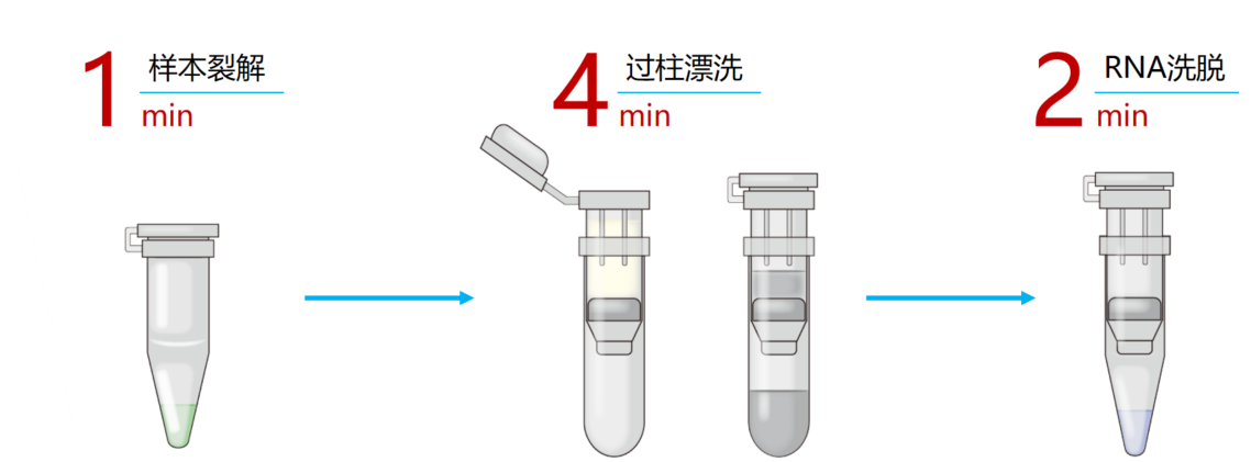 操作步驟簡單快速,可在 7 min 內(nèi)完成單個(gè)樣品 RNA 的提取,無需使用苯酚和氯仿等有機(jī)溶液,操作安全性更高。