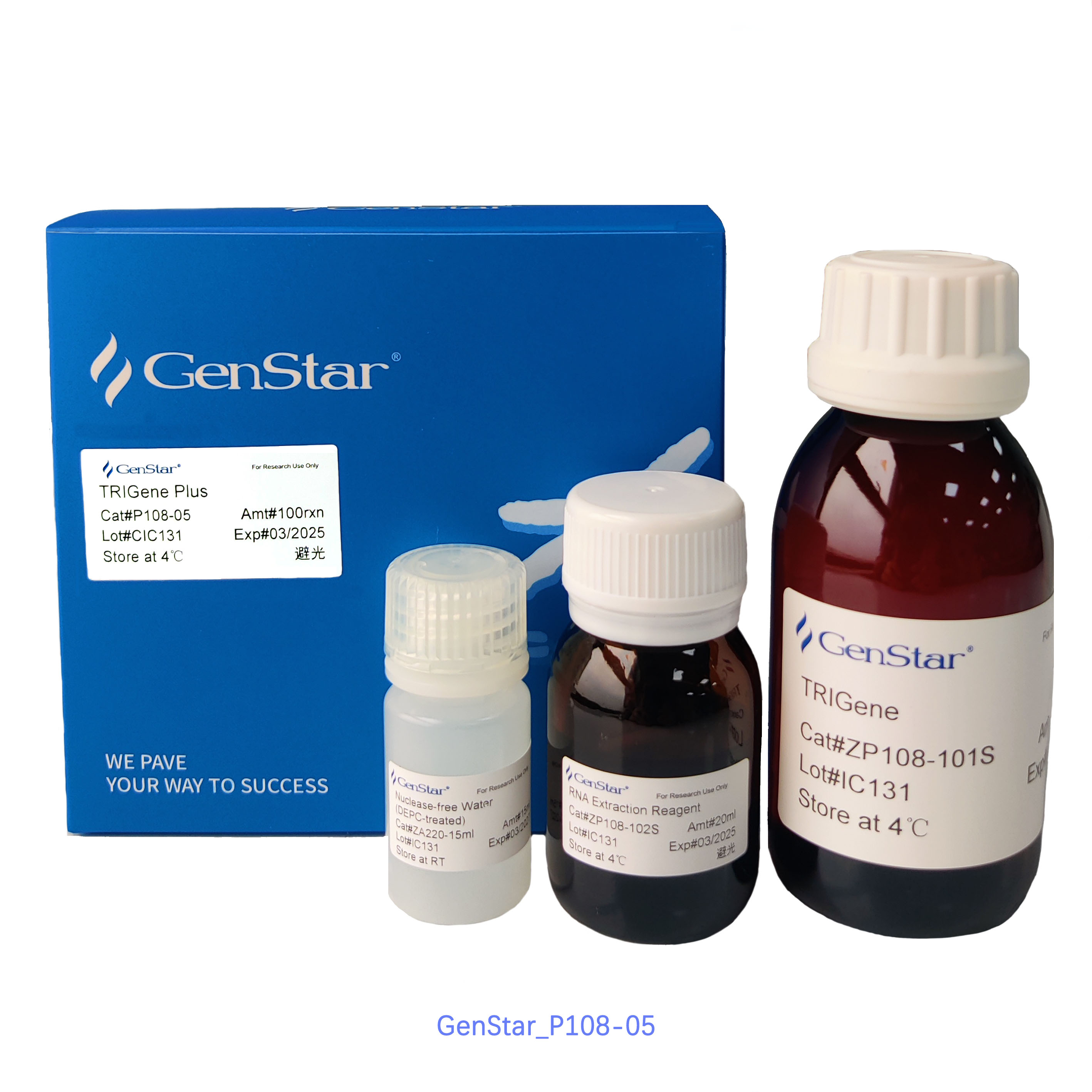 TRIGene Plus 是基于 TriZol 原理制備的一種通用總 RNA 提取試劑。其原理是利用異硫氫酸胍/酚,快速裂解細(xì)胞,溶解細(xì)胞內(nèi)含物,抑制核酸酶活性;而后加入 RNA 抽提試劑(RNA Extraction Reagent)去除雜蛋白,RNA 保留在上層水相中,分離后可用異丙醇沉淀回收獲得。采用 RNA Extraction Reagent 替代了氯仿進(jìn)行 RNA 抽提,上下分相更加清晰且操作安全性更高。使用本產(chǎn)品提取 RNA 純度高,完整度好,產(chǎn)量媲美傳統(tǒng)氯仿法抽提,可直接用于 RT-PCR、Northernblot、dotblot、polyA 篩選、體外翻譯、RNase 保護(hù)實(shí)驗(yàn)和分子克隆等一系列操作。