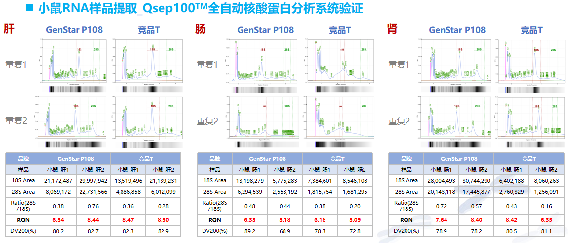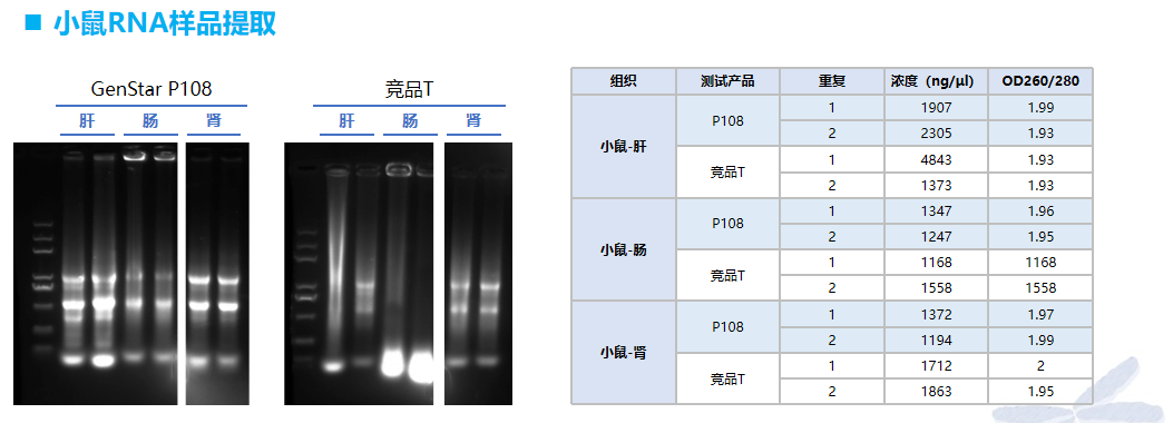 P108 可有效對小鼠不同器官組織進(jìn)行 RNA 提取,其提取得率與競品 T 相當(dāng),提取的 RNA 完整度優(yōu)于競品 T。