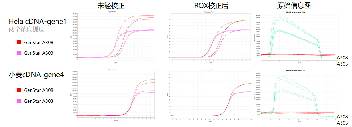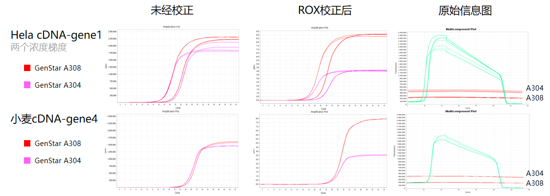 經驗證,A308 在 Low ROX 適用儀器上可進行正常校正,且 ROX 校正后效果優(yōu)于 A304。