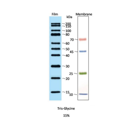 本產(chǎn)品由跨度從 10-200 kDa 的 14 種純化的天然蛋白混合而成。其中 25 kDa 條帶為綠色預(yù)染條帶、10 kDa 和 45 kDa 條帶為藍(lán)色預(yù)染條帶、70 kDa 條帶為粉色預(yù)染條帶,便于動態(tài)觀察電泳狀態(tài),方便判斷各個條帶的準(zhǔn)確位置和轉(zhuǎn)膜效果。其他 10 條條帶含有多種 IgG 亞型結(jié)合位點,可以和目的蛋白條帶同時結(jié)合抗體,用相同抗體來檢測,經(jīng)化學(xué)發(fā)光檢測或者通過 CCD 成像后顯示 15 kDa、20 kDa、30 kDa、40 kDa、50 kDa、60 kDa、80 kDa、100 kDa、150 kDa、200 kDa 條帶。