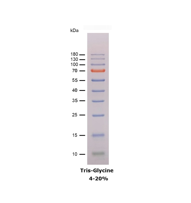本產(chǎn)品由跨度從 10-180 kDa 的 10 種高度純化預染的重組蛋白質(zhì)組成。其中 10 kDa 條帶為綠色預染條帶,70 kDa 條帶為紅色預染條帶,方便判斷各個條帶的準確位置。本產(chǎn)品適合作為 SDS-PAGE 電泳時,變性蛋白樣品的分子量參照,并可實時觀察蛋白樣品的電泳分離狀況,也可用于檢測 Western blot 的轉(zhuǎn)膜效率。由于共價結(jié)合的染料會影響蛋白質(zhì)分子的電泳遷移率,本產(chǎn)品僅適于粗略地估計目的蛋白樣品的分子量。