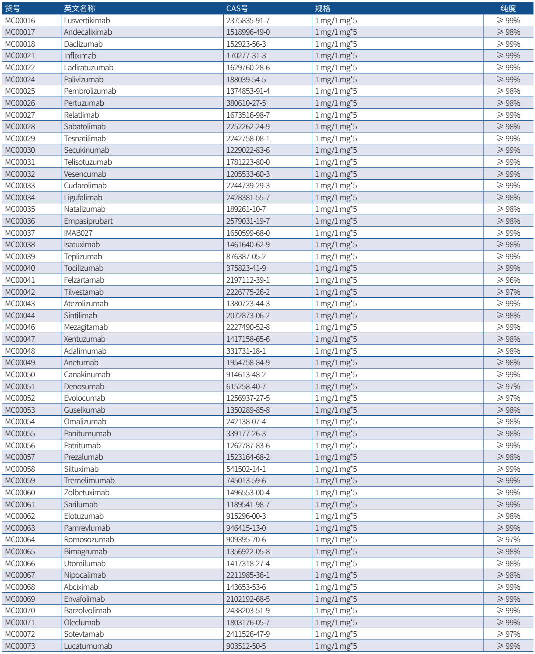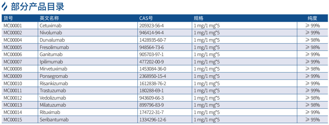 抗體抑制劑是一類能夠通過與特定抗原結(jié)合并阻斷其生物活性,從而抑制特定分子或細胞過程的抗體。抗體抑制劑具有與原始治療性抗體相同的活性生物成分,可作為陽性對照用于藥物效果評價等相關(guān)科學研究,同時也可以輔佐驗證靶點蛋白的功能活性。GenStar 現(xiàn)提供數(shù)百種抗體抑制劑助力科研工作者,包括鼠源抗體、嵌合抗體、人源抗體、雙特異性抗體等,涉及一些熱門靶蛋白 PD-L1、PD-1、VEGF、EGFR、HER2、TNF-α、CD20、Claudin18.2、CTLA4、CD3、CD47、4-1BB 等。
