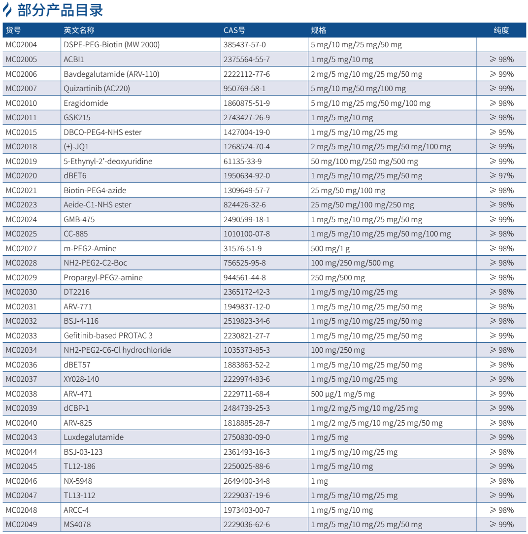在患者體內(nèi),PROTAC 的靶蛋白配體和靶蛋白結(jié)合,E3 泛素連接酶配體和細(xì)胞內(nèi)的 E3 泛素連接酶的底物結(jié)合區(qū)結(jié)合,從而通過(guò) Linker 把靶蛋白“拉近”到 E3 泛素連接酶旁邊,實(shí)現(xiàn) UPS 系統(tǒng)將靶蛋白降解。GenStar目前可提供多種 PROTAC 相關(guān)分子產(chǎn)品,包含:PROTACS、PROTACLinker、Ligands for E3 Ligase.Ligands for Target Protein for PROTAC、 Molecular Glues、ATTECs、E3 Ligase Ligand-LinkerConjugates 等。
