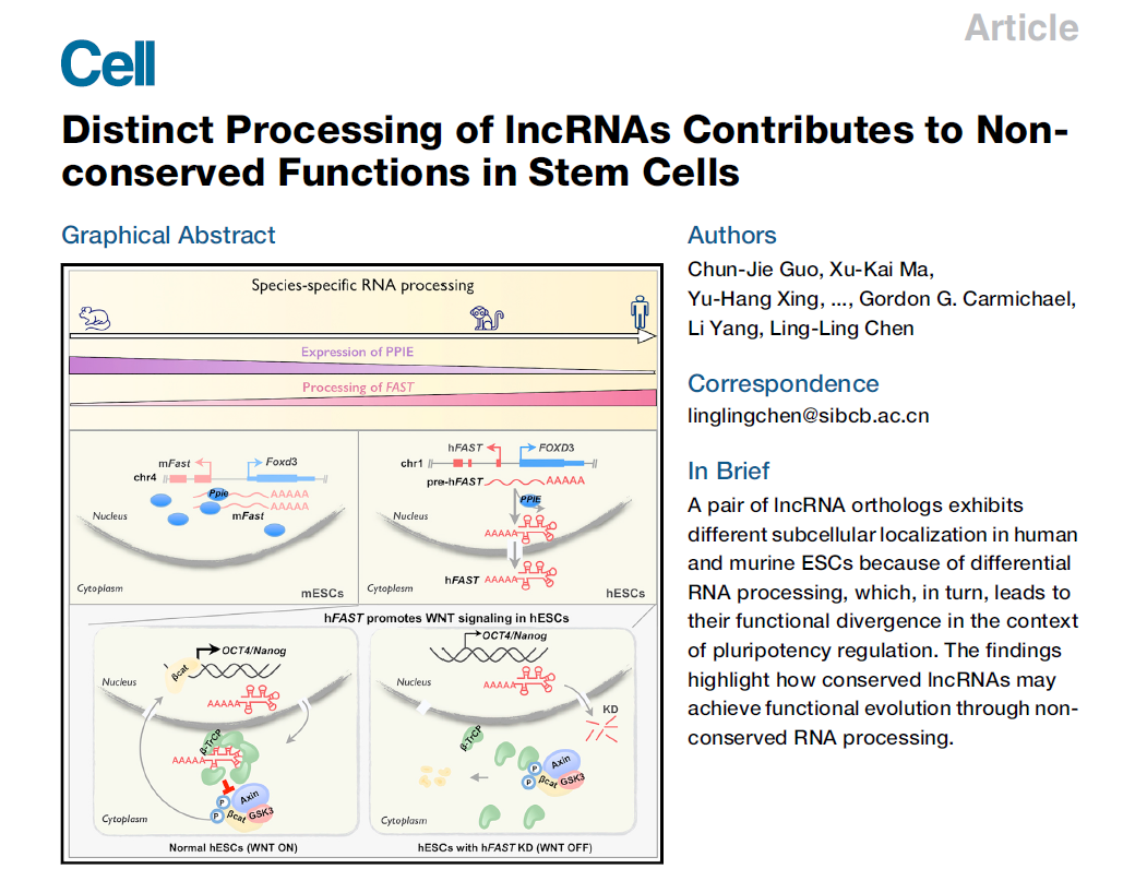 2020年4月6月,中國科學(xué)院分子細(xì)胞科學(xué)卓越創(chuàng)新中心(生物化學(xué)與細(xì)胞生物學(xué)研究所)陳玲玲研究組在國際知名雜志Cell在線發(fā)表了一篇題為’’Distinct processing of lncRNAs contributes to non-conserved functions in stem cells”的研究論文。