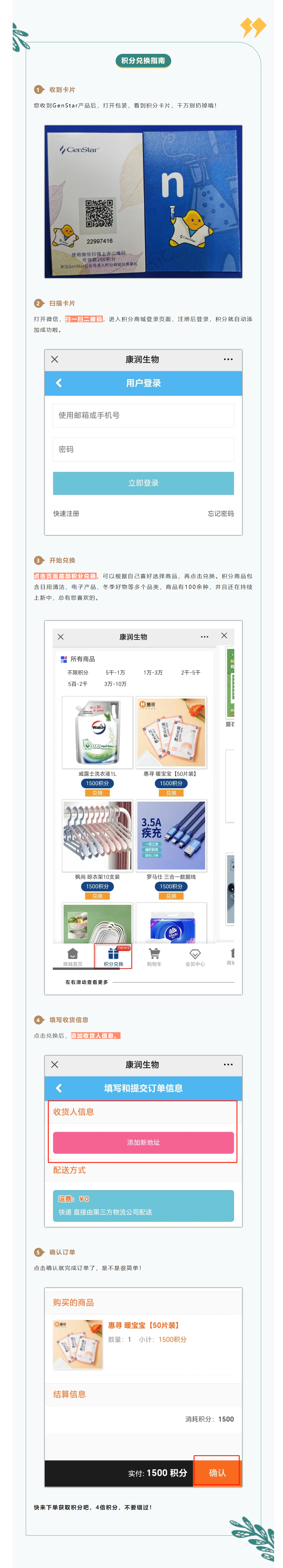 作為GenStar產(chǎn)品忠實(shí)用戶,不會(huì)用積分,那豈不是錯(cuò)過了一個(gè)億?積分可用于GenStar積分商城(點(diǎn)擊進(jìn)入)兌換禮品,積分越多,禮品越優(yōu)厚。不知道怎么操作?別擔(dān)心,來看看下方的兌換指南!